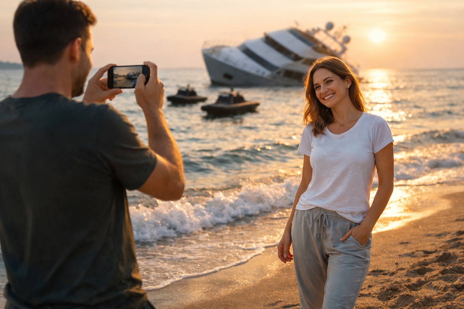 Mientras reían y preparaban la cámara, notaron de repente un movimiento en el horizonte. Al principio parecía un barco cualquiera, pero a medida que se acercaba, se hacía evidente que no lo era: se trataba de un impresionante y lujoso yate privado. La elegante embarcación avanzaba casi en silencio sobre el agua y finalmente se detuvo a cierta distancia de la costa.